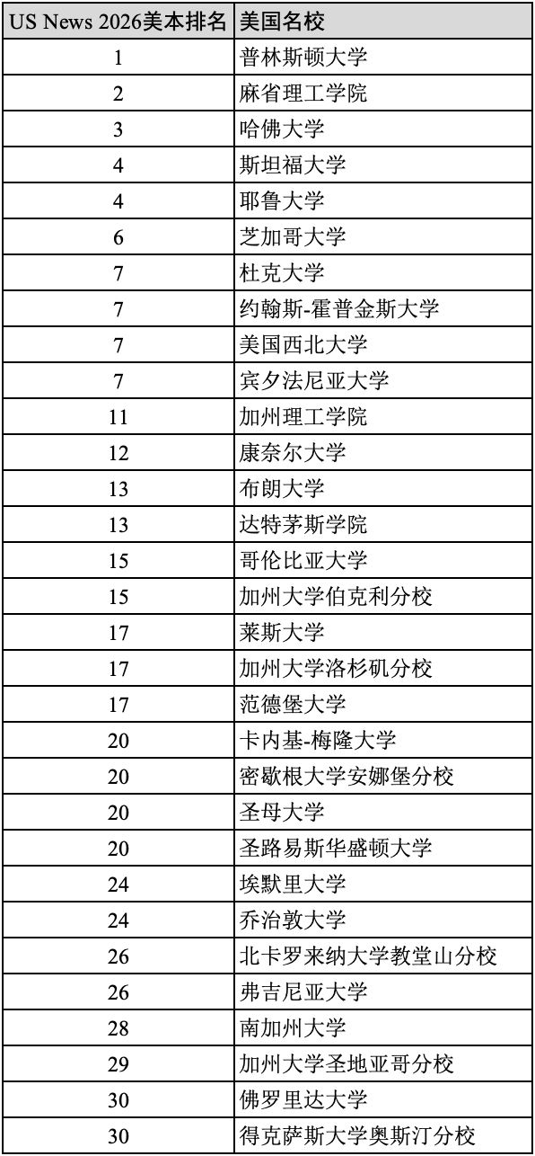 在2026年度US News美国大学本科院校排名中,排在全美前30的名校分别是: